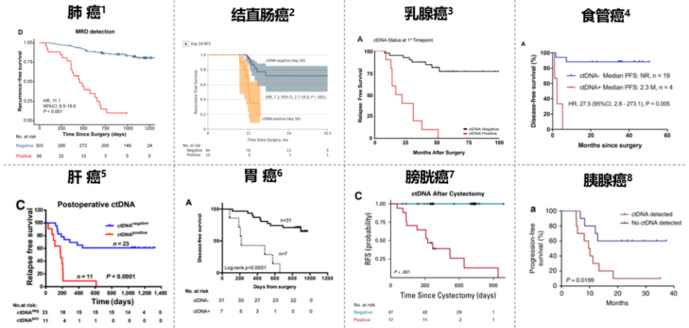 MRD概念最早在白血病诊疗中提出,是指白血病经过诱导化疗完全缓解(CR)后或骨髓移植治疗后,在体内残留少量白血病细胞的情况,用于预测复发风险和指导后续治疗。近年来,国内外在实体肿瘤中关于MRD评估的临床数据和证据也越来越多,开启了实体肿瘤MRD检测的热潮。下面汇总的是8种实体瘤的MRD与肿瘤预后方面的研究进展,发现MRD阳性肿瘤患者的预后普遍比MRD阴性患者差,数据均具有显著性差异[Xia L,2022] [Reinert T,2019] [Coombes RC,2019] [Liu T,2021] [Cai Z,2019] [Yang J,2020] [Christensen E,2019] [Sausen M,2019]。