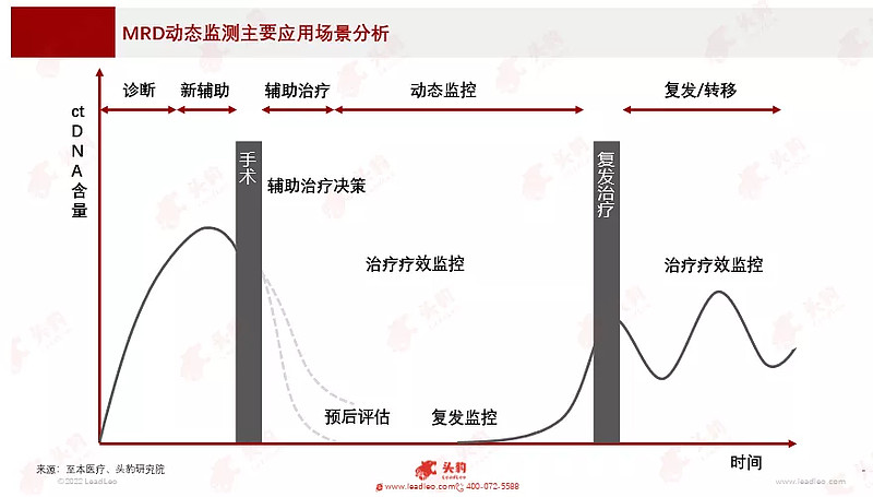MRD在实体肿瘤诊疗的不同阶段均有相关的临床应用,比如在肿瘤早期可以进行肿瘤良恶性的辅助诊断,在肿瘤早中期可以对手术前的新辅助治疗效果评估、手术后的辅助治疗效果评估,后续治疗过程的动态监测,肿瘤复发后的治疗效果评估及疗效监测。