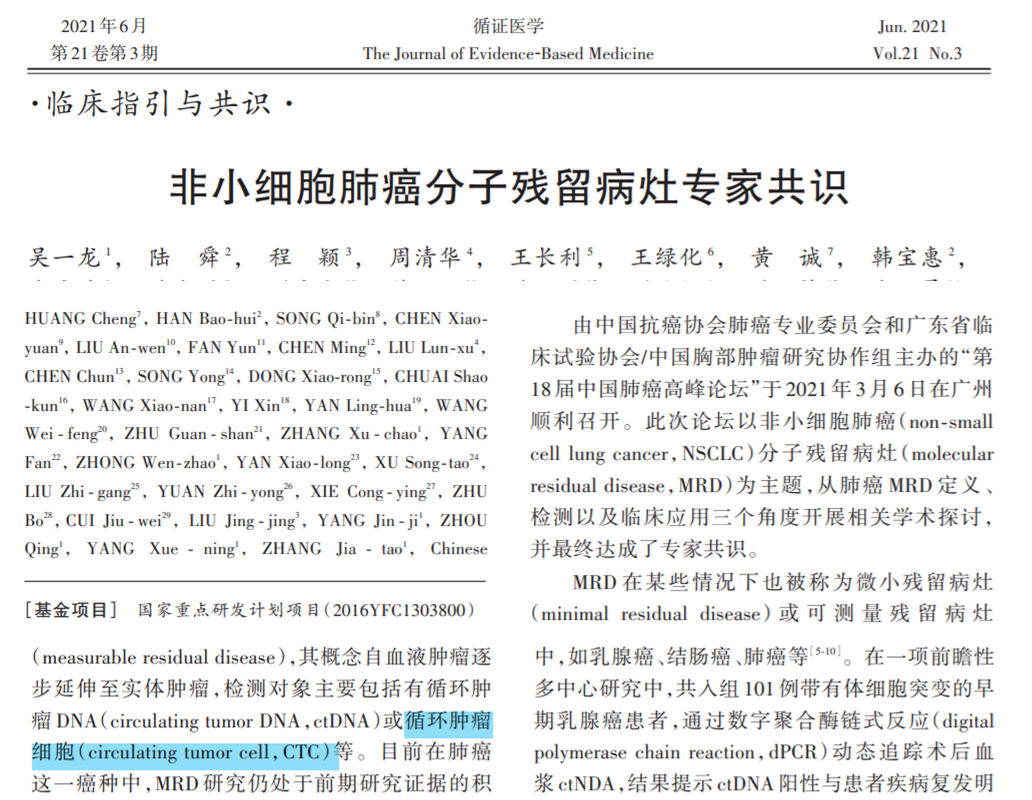 2021年6月,国内肺癌领域的临床专家发表了第一篇关于MRD专家共识《非小细胞肺癌分子残留病灶专家共识》。共识指出:MRD在某些情况下也被称为微小残留病灶,其概念自血液肿瘤逐步延伸至实体肿瘤,检测对象主要包括有循环肿瘤DNA、循环肿瘤细胞等。