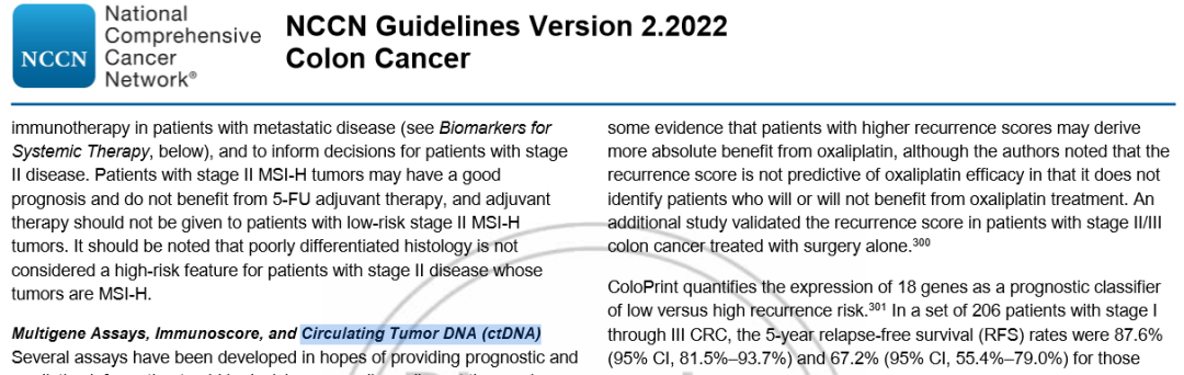 2022年,国外结肠癌NCCN指南推荐可基于ctDNA来做MRD检测,并指出基于ctDNA指导的MRD评估可提示结肠癌患者接受治疗后的预后情况,ctDNA作为肿瘤标志物动态评估肿瘤复发风险。